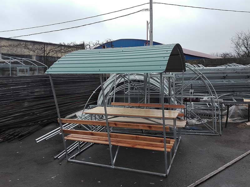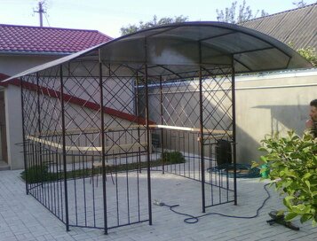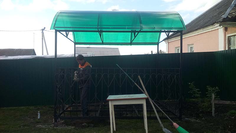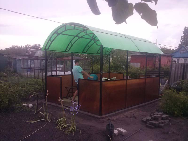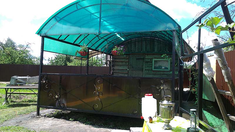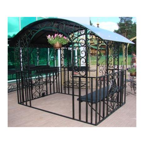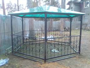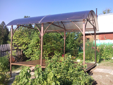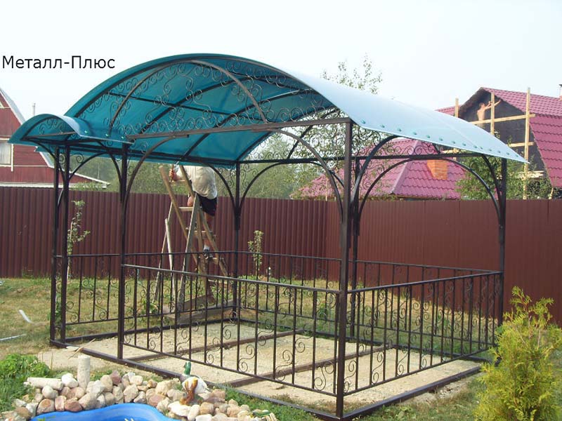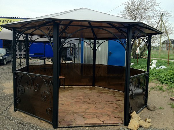 У нас вы можете заказать беседки с элементами художественной ковки и покрытием из поликарбоната по цене от 12000 рублей.