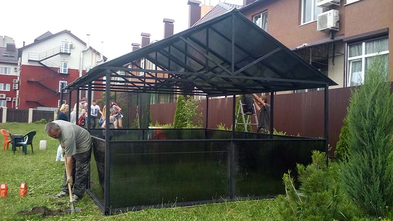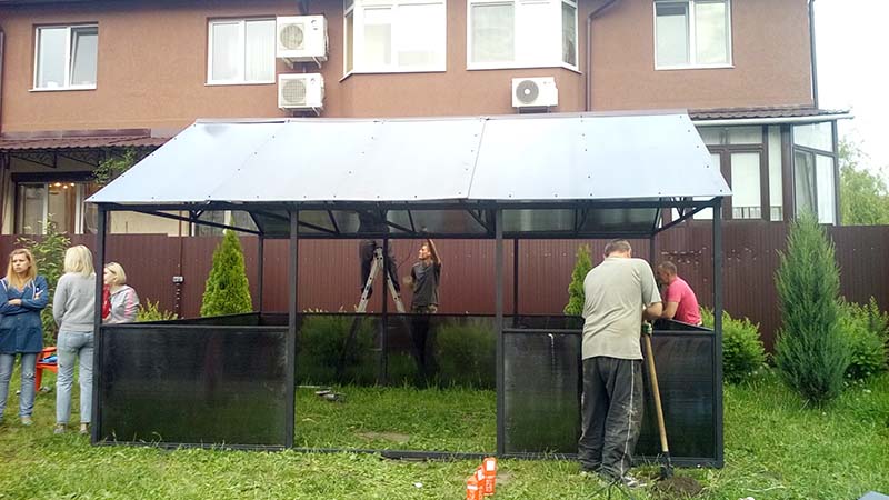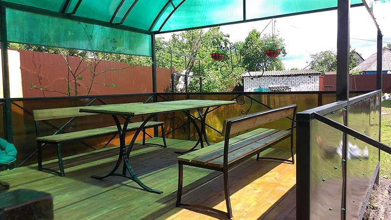 Профильная труба по своим размерам намного тоньше чем деревянный брус, а прозрачность поликарбоната придаст невесомость всей конструкции. Преимущества изготовления беседки на заказ из данных материалов очевидны, они не поддаются гниению и создают необходимую жесткость каркаса.