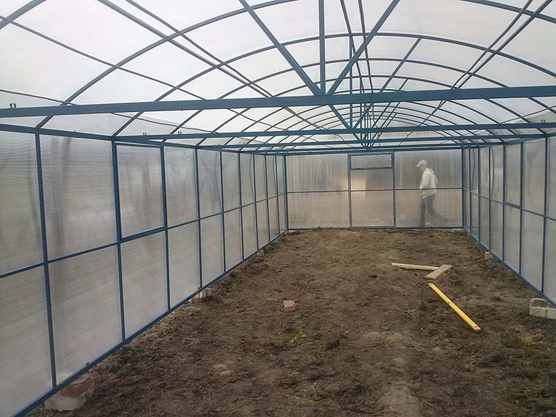 Базовые размеры теплицы составляют 6 х 3 м, чего достаточно для выращивания всех популярных культур. При необходимости изготовления конструкций на заказ специалисты проводят предварительное проектирование с учетом всех технических нюансов. Торцевая часть тепличных сооружений состоит из цельных сварных дуг, что положительно сказывается на жесткости и прочности изделия.